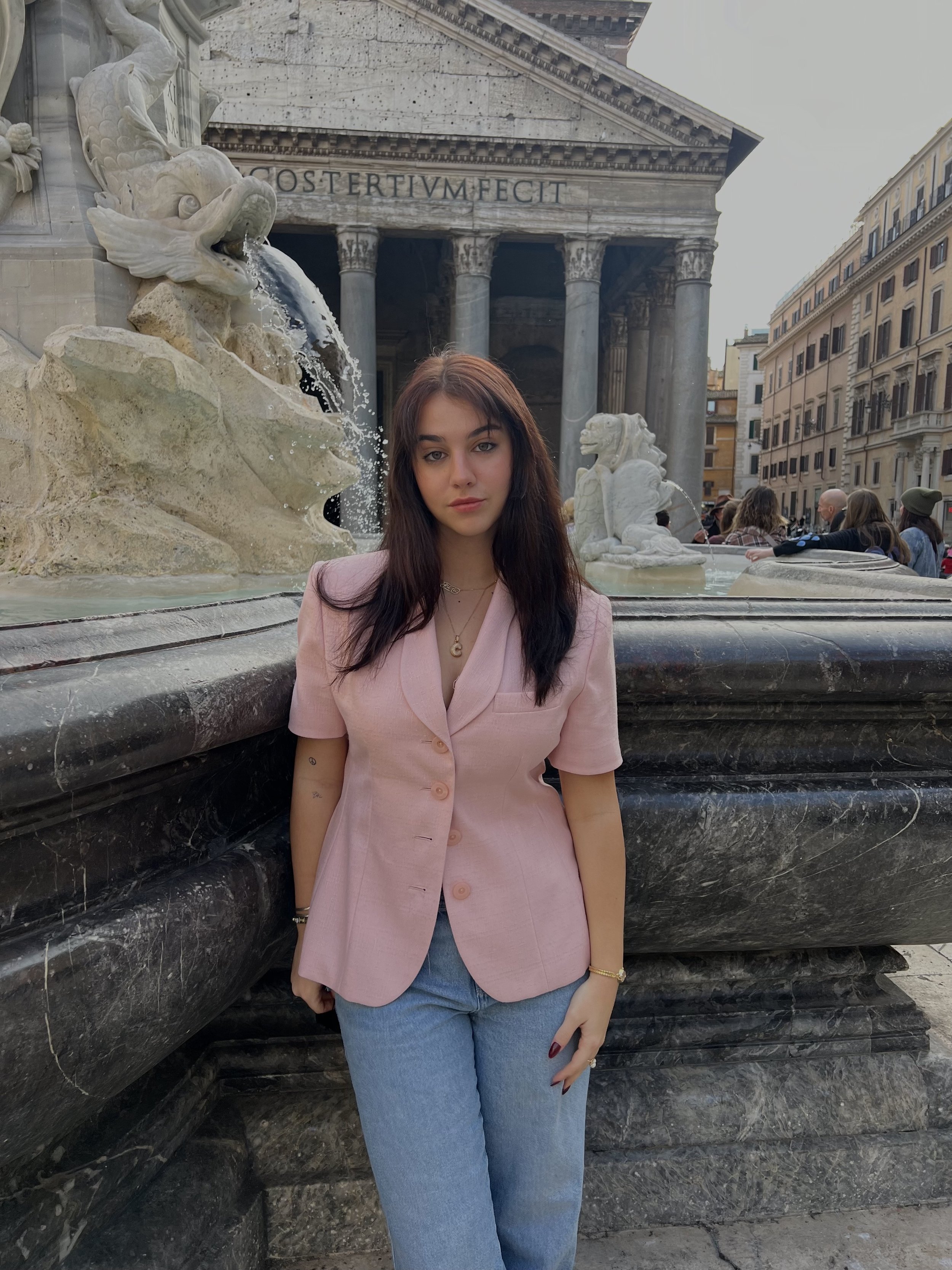 Back in Rome for a second semester and this was our first day out. I thrifted this baby pink short sleeved blazer from Goodwill and paired it with low rise jeans from Pacsun. You can’t see my shoes but I am wearing brown and white Nike low dunks.