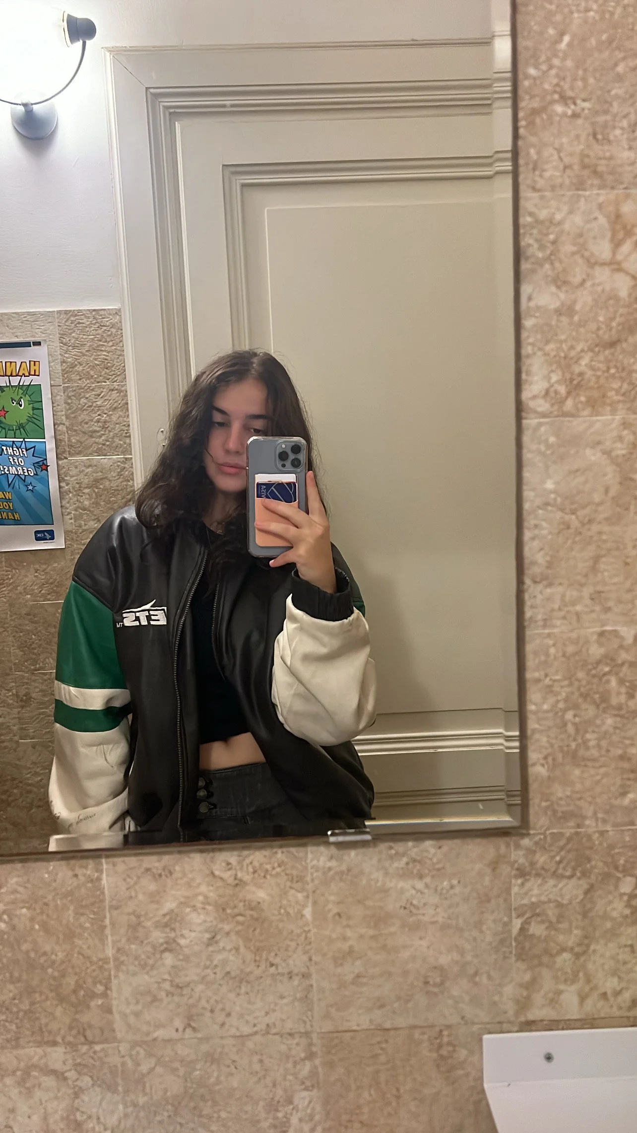 New York Jets leather jacket was thrifted in Rome, jeans are New York and Company, and paired with a plain black tank top underneath.