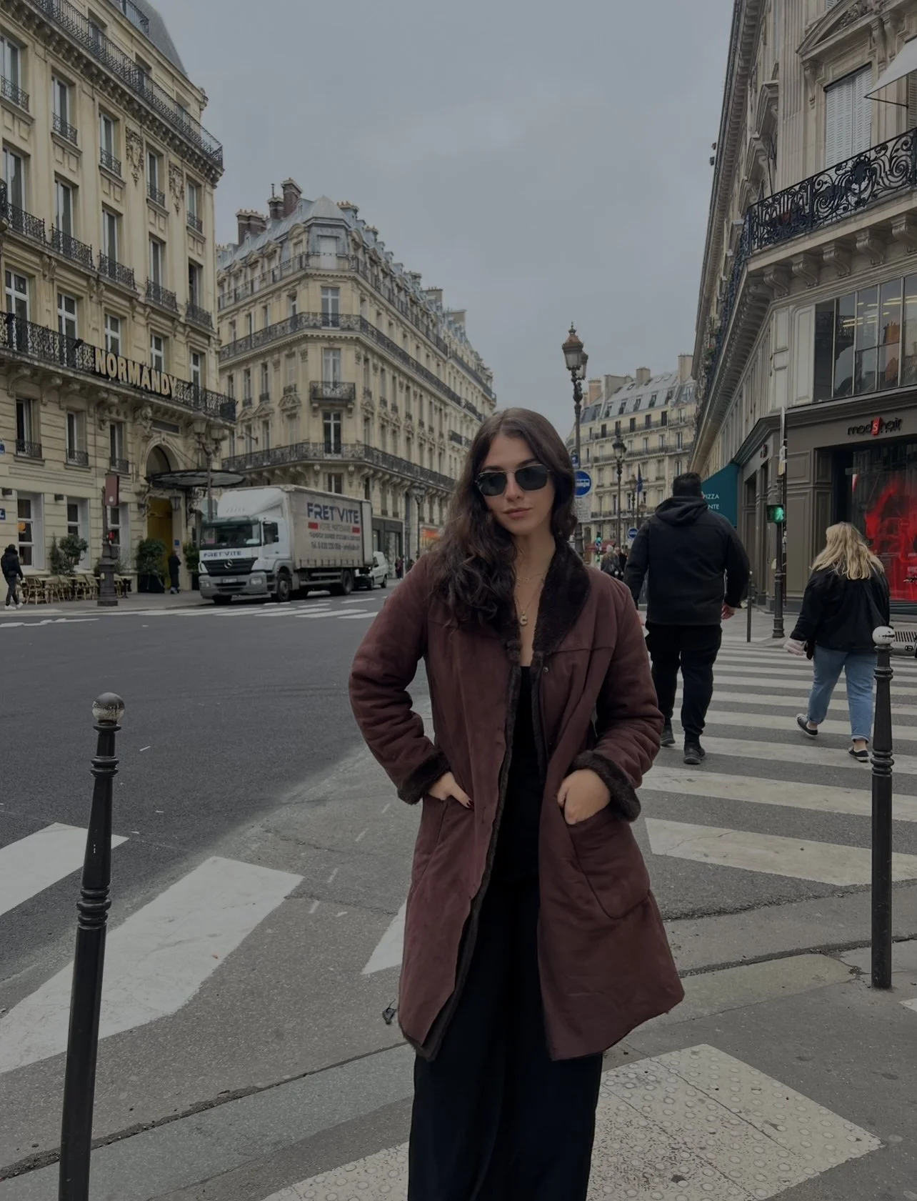 Paris weekend but also freezing! Same Levi jeans, my black off-the-shoulder top from Amazon, same black leather jacket, and LV trainers. I stole Faiths scarf for the day.